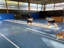 Zuerst führte Chris durch die einzelnen Stationen: Neben einem großen Parcour, der in der schnellstmöglichen Zeit absolviert werden musste, gab es auch die bereits bekannten Sport-Stations, die viele Bewegungs-, Schnelligkeits- und Koordinationsübungen ermöglichen. Zusätzlich waren einzelne Inseln aufgebaut, in denen verschiedene Übungen zum Bereich Geschicklichkeit (u. a. Zielwürfe, Boccia) und Kraft (u. a. Wechselsprünge, Burpees) durchgeführt werden konnten. Das Highlight war aber sicherlich die Eisstockbahn, die begeisterten Anklang bei den Kindern fand.