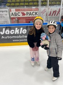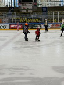 In der Eishalle angekommen ging es rasch los: Während einige Kinder sofort sicher und mit großer Geschwindigkeit über das Eis glitten (einige davon sogar in Eishockeymontur), näherten sich andere zunächst vorsichtig der glatten Fläche und tasteten sich Schritt für Schritt heran. Schnell zeigte sich jedoch, dass mit etwas Übung und Mut jeder Fortschritte machen kann – und so wurde aus anfänglicher Zurückhaltung bald echtes Fahrvergnügen.