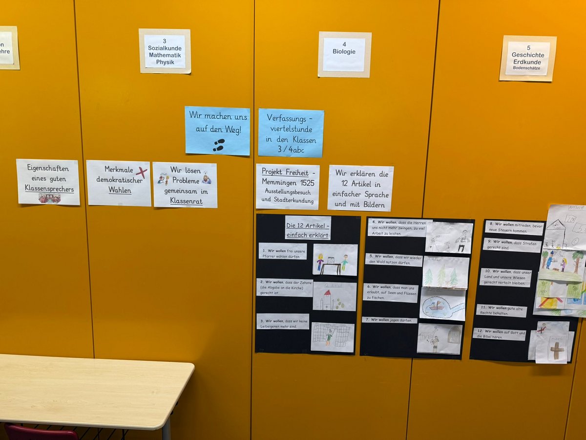 Neben Themen wie "Klassensprecher" oder "Klassenrat" ist in diesem Jahr der Bauernkrieg 1525 mit den 12 Artikeln ein wichtiges Thema, das kindgerecht und sogar mit einem Ausflug nach Memmingen behandelt wurde. Ergebnisse, wie die Klasse 3/4b die 12 Artikel in einfacher Sprache und in Bildern erklärt, sind im Folgenden zu sehen:
